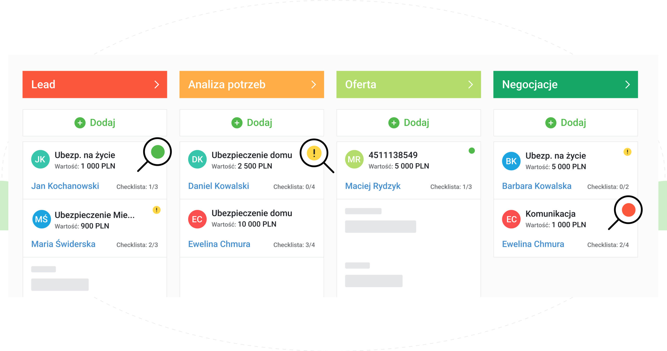 Przykład: dashboard doradcy w CRM: 10 klientów do kontaktu dziś, 6 w tym tygodniu, 4 w przyszłym. Każdy z przypomnieniem, dlaczego ten kontakt jest ważny.
